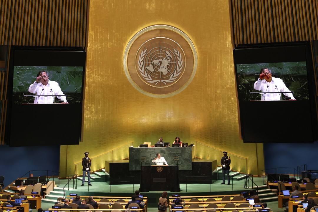 Colombia Presiden Gustavo Petro Urrego addresses the 80th session of the United Nations General Assembly on Tuesday at UN headquarters.   (AP Photo/Pamela Smith)