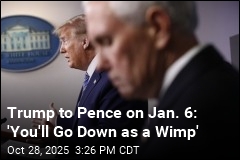 Politics | Mike Pence Trump to Pence on Jan. 6: 'You'll Go Down as a Wimp' New book has details from the former vice president's notes By John Johnson Posted Oct 28, 2025 3:26 PM CDT Copied Then-Vice President Mike Pence, right, listens as President Trump speaks at the White House, Sunday, April 19, 2020, in Washington. (AP Photo/Patrick Semansky, File) A new book by ABC News reporter Jonathan Karl has new details about an exchange between President Trump and Vice President Pence on the morning of the Capitol riot in 2021. The book—Retribution: Donald Trump and the Campaign that Changed America—says an angry Trump called Pence after learning that his vice president would not try to block the certification of Joe Biden as the election winner. "You'll go down as a wimp," Trump said, according to a note Pence scrawled on his day planner. At other points, Trump said, "If you do that, I made a big mistake five years ago," and "You listen to the wrong people." Karl tweeted an image of the Pence notes, adding that special counsel Jack Smith planned to use them at trial had his case against Trump gone to trial. "I said we both [took] an oath to support + defend the Constitution," Pence responded to Trump, according to his notes. "It doesn't take courage to break the law. It takes courage to uphold the law." That Trump referred to Pence as a "wimp" during their final phone call has been previously reported, but the newly revealed notes provide the full line and more context. Read These Next Game 3 of the World Series took a historically long time to wrap up. Bill Gates wants less 'doomsday' talk on climate change. Trump has been talking about a White House ballroom for 15 years. Monstrous Hurricane Melissa makes landfall in Jamaica. Report an error