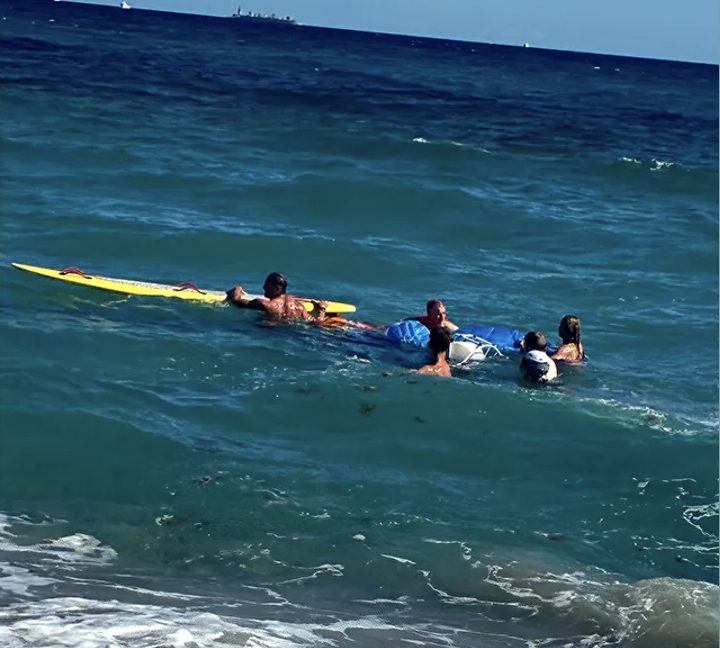 Lifeguard Sarah Williamson of Palm Beach County Ocean Rescue tells WFLX she started sprinting as soon as she realized something was wrong and radioed a colleague, and the pair paddled out with rescue gear. Beachgoers also jumped in, including a snorkeler who dove beneath the surface to untangle the man from his lines. The snorkeler "was a godsend because we did not have a mask, and he was able to get underwater and free the man while we secured him," Williamson says.
