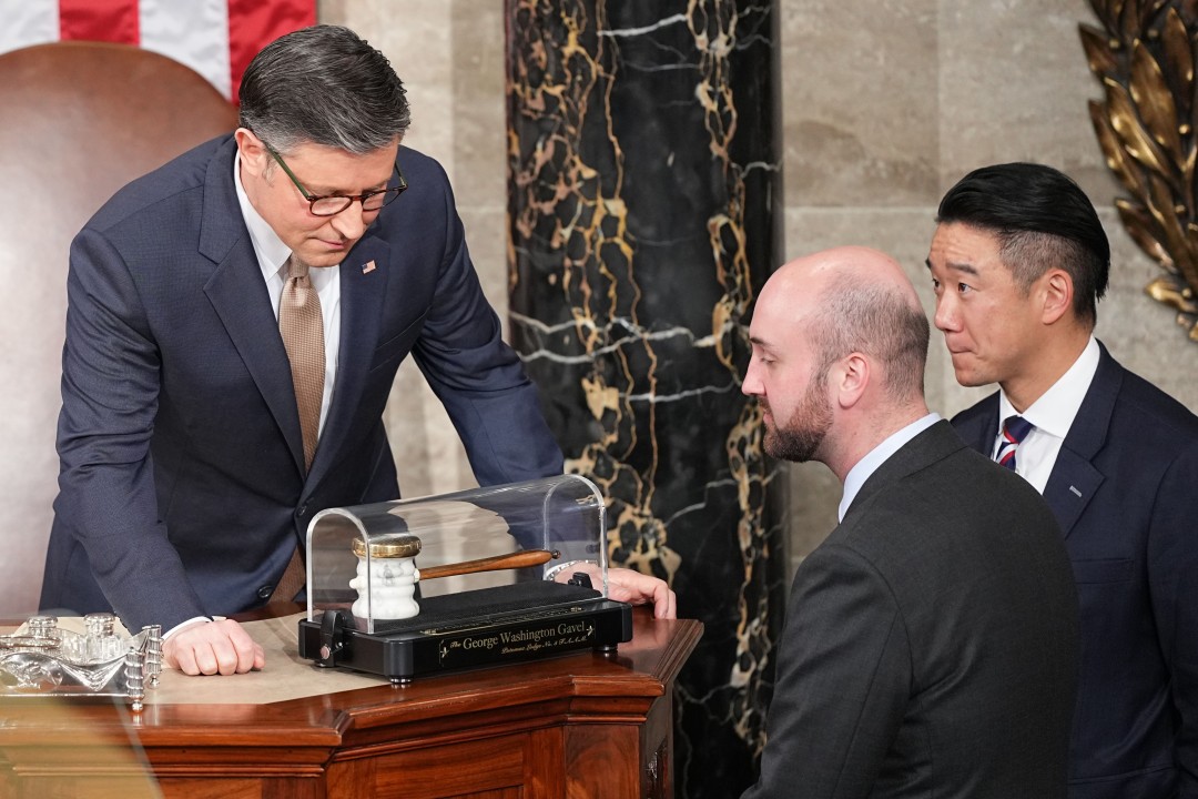 House Speaker Mike Johnson of La., looks at the George Washington Gavel before President Donald Trump delivers the State of the Union address to a joint session of Congress in the House chamber at the U.S. Capitol in Washington, Tuesday, Feb. 24, 2026.   (AP Photo/Matt Rourke)