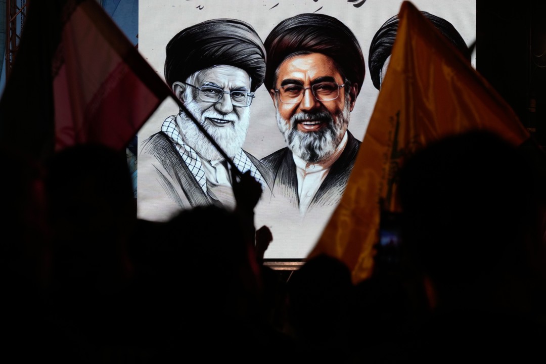 Shiite Muslims wave Iranian flags and display portraits of the late Iranian Supreme Leader Ayatollah Ali Khamenei and his son, Ayatollah Mojtaba Khamenei, during the annual Quds Day, or Jerusalem Day, rally in support of Palestinians, in Baghdad, Iraq, Friday, March 13, 2026. (AP Photo/Hadi Mizban)
